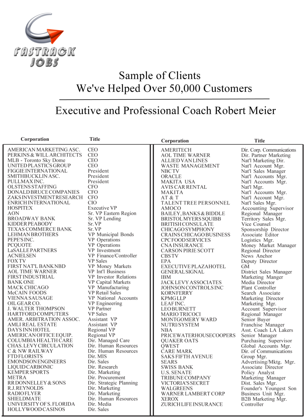 Developed Fastrack... step-by-step “4-week” job search action plan that has been proven to shorten a job search by 75% for over 100,000 clients